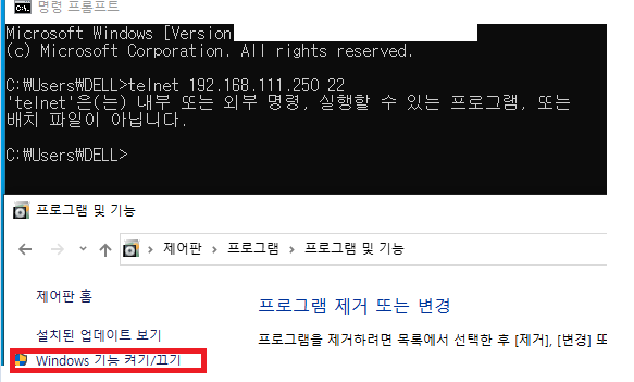 제어판>프로그램>프로그램 및 기능 > windows 기능 켜기/끄기 클릭 후 텔넷 클라이언트의 기능을 켜야 한다.