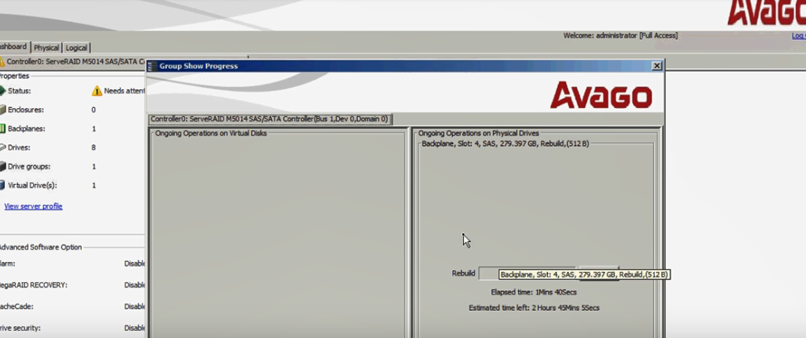 (3-2)새 디스크 넣으면 다음과 같이 rebuild 상태가 되면서 해당 자리에 새롭게 디스크 인식됨.
