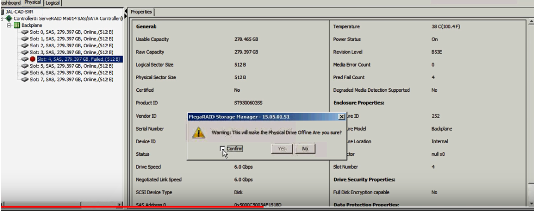 (3)offline되면 상태에 offline뜨면 failed 디스크 빼고 해당 slot 4번의 디스크가 빠졌는지 확인한다.