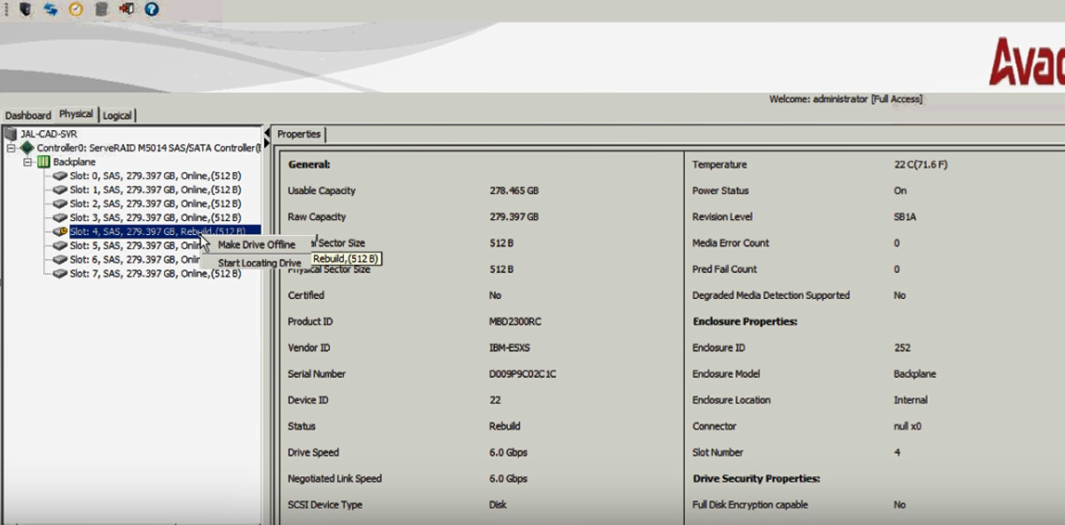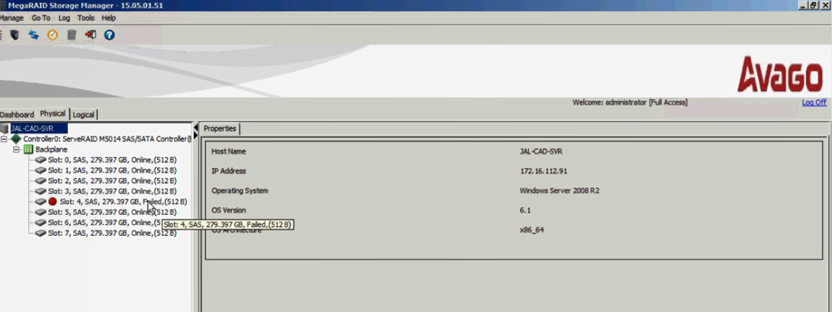 (3-1)Offline된거 확인 후 fault 디스크 빼기 그러면 다음과 같이 슬롯이 아예 사라짐.