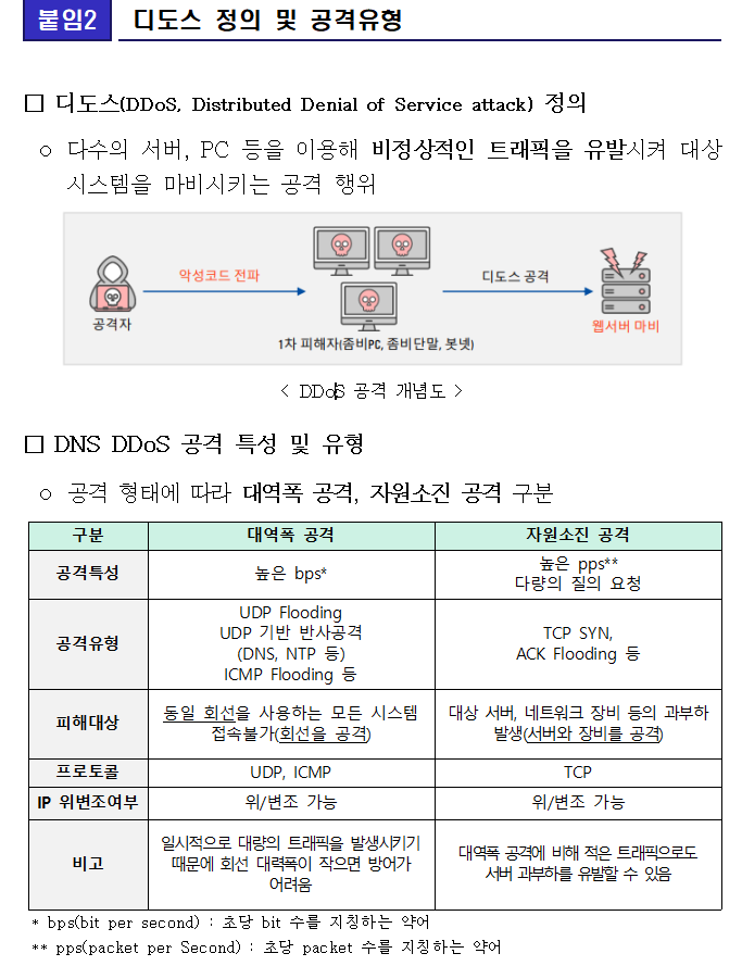 우선 DNS와 DDoS 의 정의 및 공격 유형 또한 해당 사이트에 나와있으며 캡쳐본은 다음과 같다.