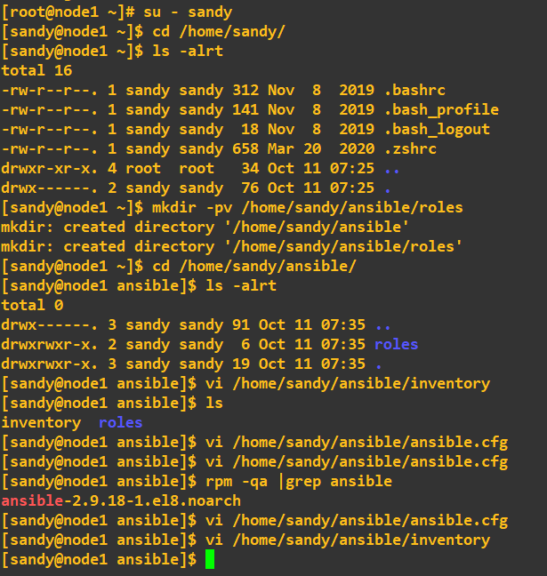 1.제어노드에서 sandy라는 일반 유저명으로 관리host에 ssh 접속을 수행한다.