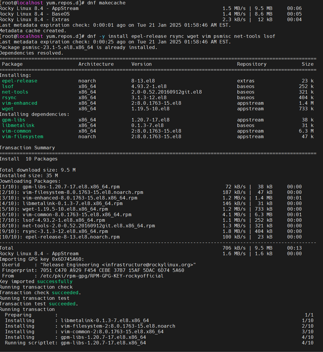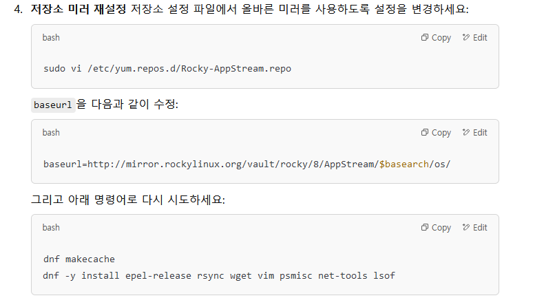 - 저장소 업데이트 확인 Rocky Linux 8은 더 이상 지원되지 않거나 URL이 변경되었을 가능성이 있으므로 저장소 설정 파일(/etc/yum.repos.d/)을 확인해야 합니다. 먼저 아래 명령어를 실행하여 저장소 정보를 확인하세요