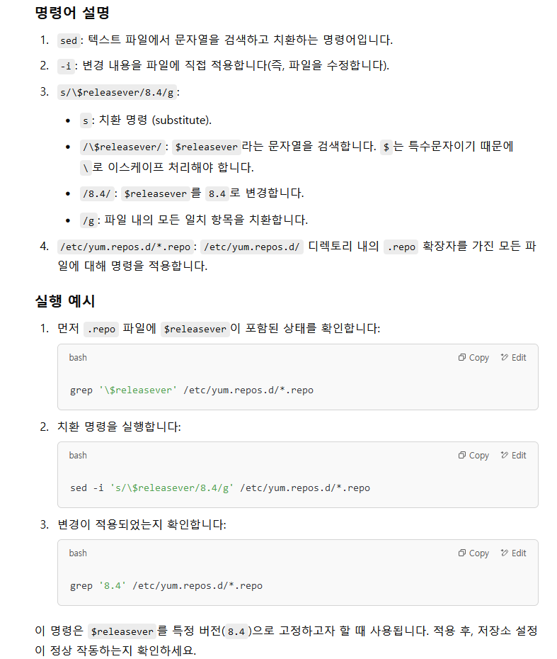 치환문으로 sed 명령어를 통해 releasever를 8.4로 변경하는