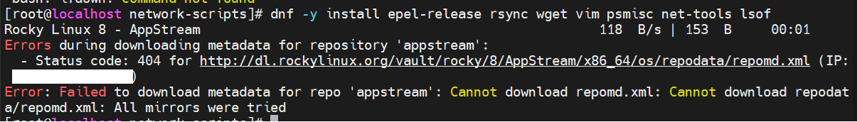해당 오류는 dnf 명령어가 Rocky Linux 8에서 사용하려는 저장소(AppStream)의 메타데이터를 다운로드하지 못해서 발생한 것입니다. 이는 주로 다음과 같은 이유로 발생합니다: