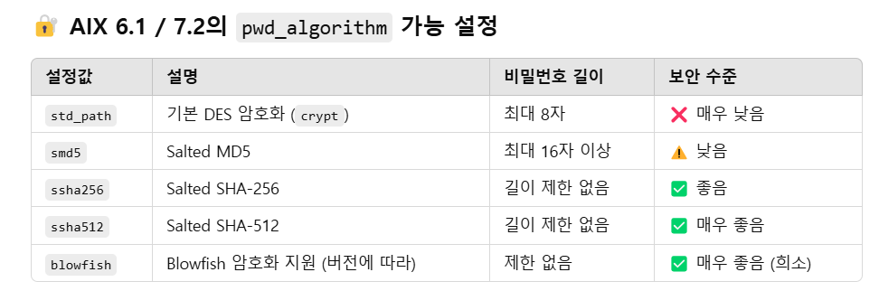 - pwd_algorithm=std_path는 AIX가 기본(legacy) 암호화 알고리즘, 즉 DES(데이터 암호화 표준) 을 사용하게 만듭니다.