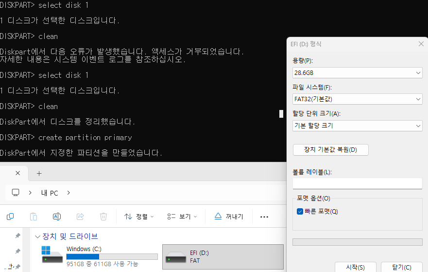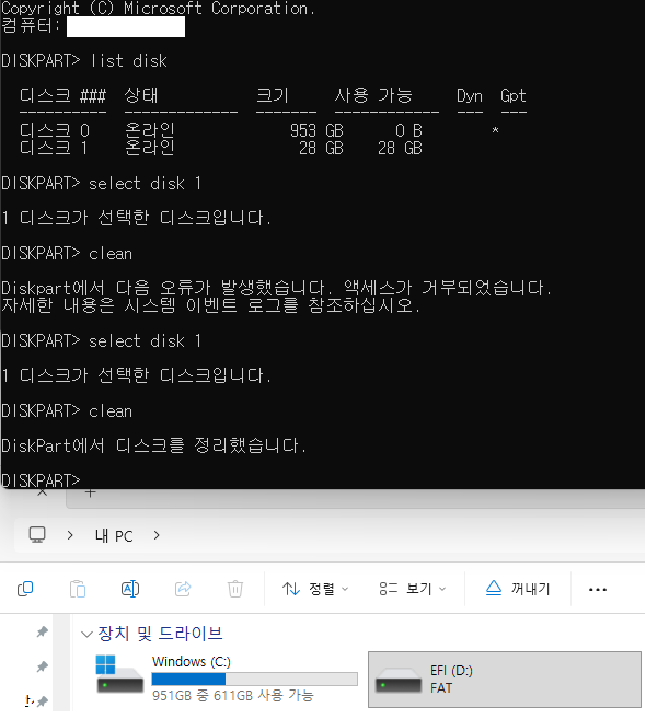 내가 선택할 디스크는 32GB USB (디스크 1)이므로, 해당 디스크 번호를 다음과 같이 선택한다.