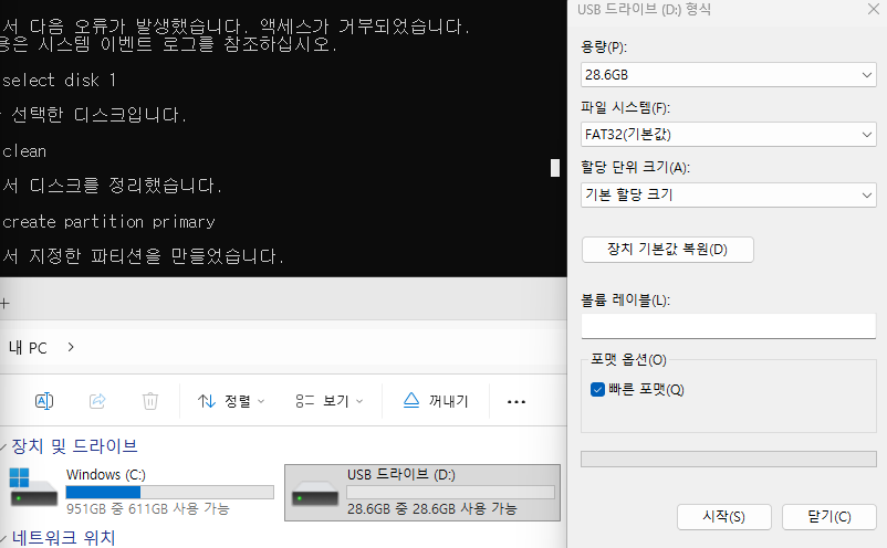 해당 디스크의 우클릭으로 >>포맷 [선택할 것!]