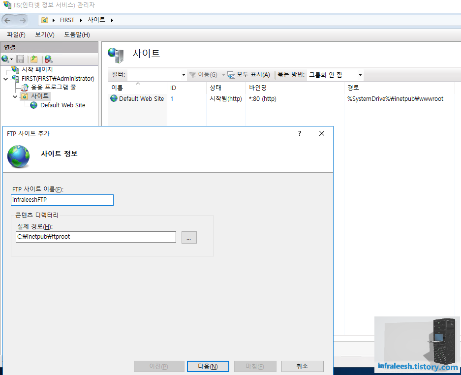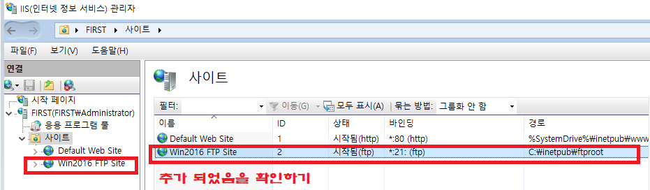 해당 서버의 사이트에 web site 만 있는것 확인. [FTP 사이트가 없으므로 추가할 것!]