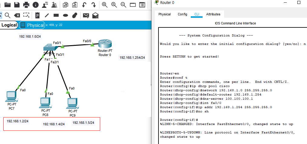 우선 라우터에 dhcp pool 명칭을 cisco 라 해놓고, IP 및 게이트웨이, dns 서버 IP를 설정해보자