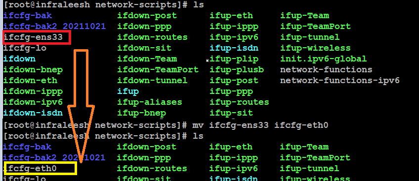 밑의 예시는 NIC interface명 이 현재 ens33인데, eth0으로 바꿔보는 작업은 다음과 같습니다.