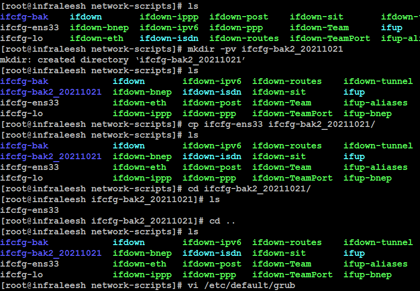 다음과 같이 오늘날짜로 디렉터리를 만들어 우선 해당 인터페이스 ifcfg-ens33을 20211021으로 넣었습니다.