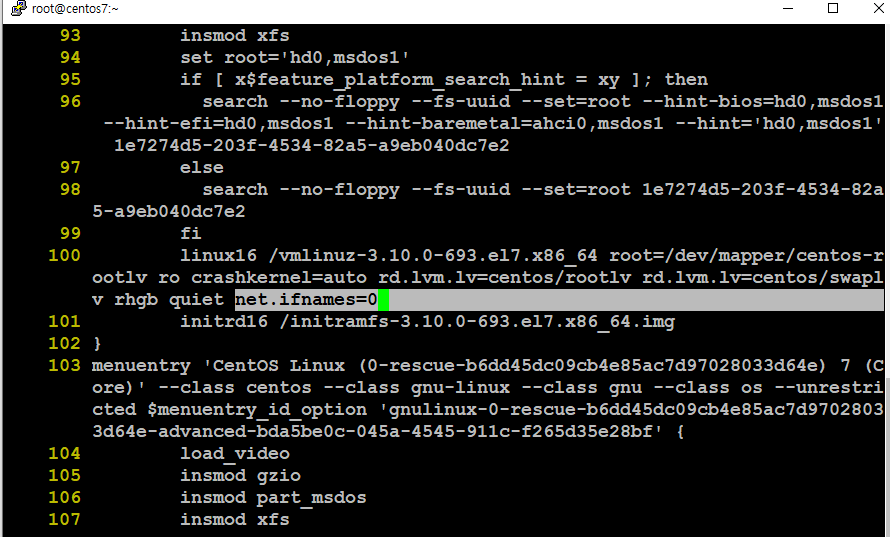 1.grub쪽에 net.ifnames=0 추가 및 grub2-mkconfig 구성 명령어로 grub구성파일 수정하기