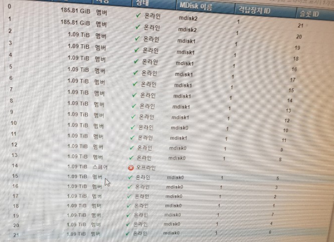 drive ID :14는 사라졌으며, 새로 생긴 드라이브 id:21은 멤버로 리빌딩 중이지만, 리빌딩이 완료되면