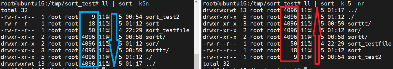 디렉토리 목록을 파일 사이즈별로 소팅 (기본값: 오름차순 -n 옵션) 디렉토리 목록을 파일 사이즈별로 역순 소팅 (내림차순 r옵션) |
