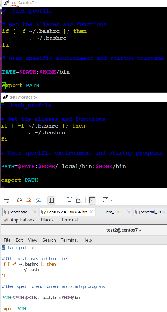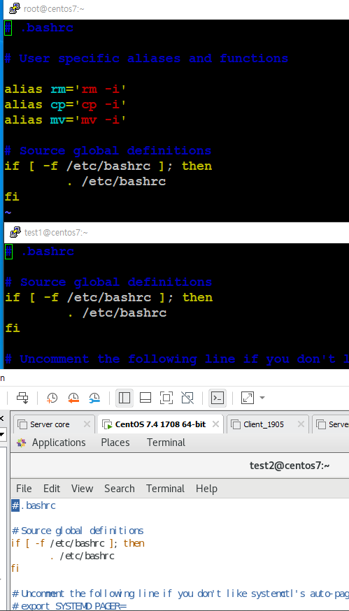 | .bashrc | 해당 파일은 전역 설정 파일인 /etc/bashrc 가 먼저 수행된 다음에 .bashrc가 수행된다. /etc/bashrc : 전역설정 파일, 모든 사용자에게 영향 줌 ~/.bashrc : 오직 bash를 실행하는 사용자에게만 영향을 줌. <그림1> 참조: 사용자 root, test1,test2의 ~/.bashrc 에 담겨진 내용 |