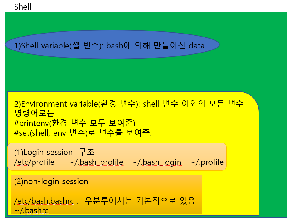 | 사용자 환경 변수 | 특정 사용자에 대해서만 정의된 환경 변수 로컬 terminal session 또는 remote login session을 사용하여 로그인 할 때마다 load 읽어옴. 특정사용자의 홈 디렉터리 경로에서 숨긴 파일인 .bashrc , .bash_profile, .bash_login , .bash_logout .profile (ubuntu ) // .bash_profile(CentOS) ![]() |