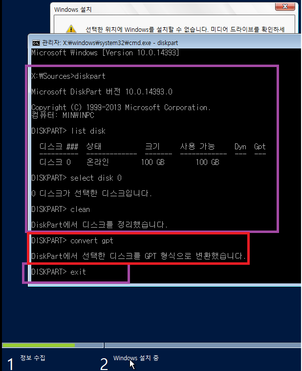 | shift + F10 으로 터미널 창 띄움 >diskpart |