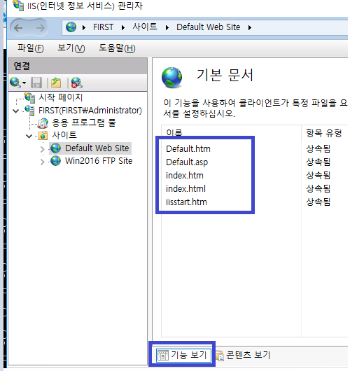 [▼사이트] > [Default Web Site] > [ 콘텐츠 보기 ] : 현재 기본적으로 제공되는 웹 페이지가 확인됨.