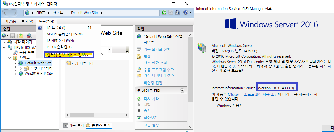 2-1 inetmgr > 도움말 > 인터넷 정보 서비스 정보 란에서 IIS (Version10.0. ) 으로 파악 가능