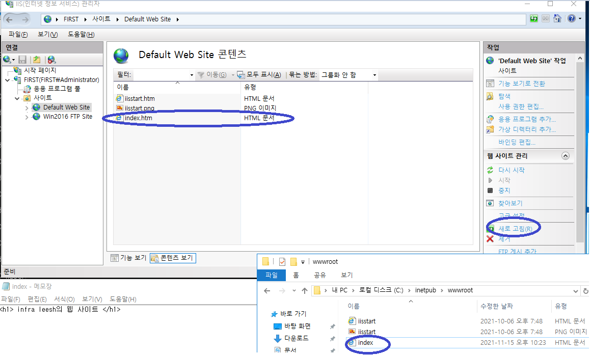 해당 경로 (C:\inetpub\wwwroot)에 새로 파일을 notepad로 index.htm 파일을 생성하였다.