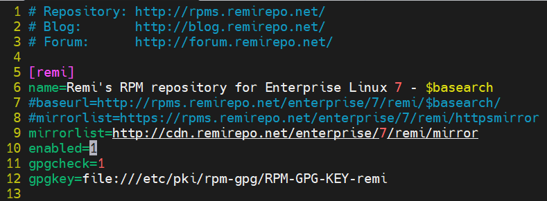 여기서 remi.repo에 vi editor 를 활용하여, 10번째 줄 enabled=0이었던 것을 1로 변경하면 된다.