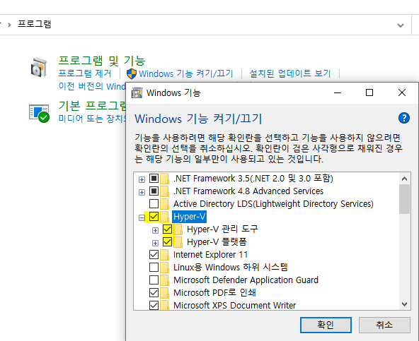 Hyper-V 하위 2개 체크한 채로 설치할 것.